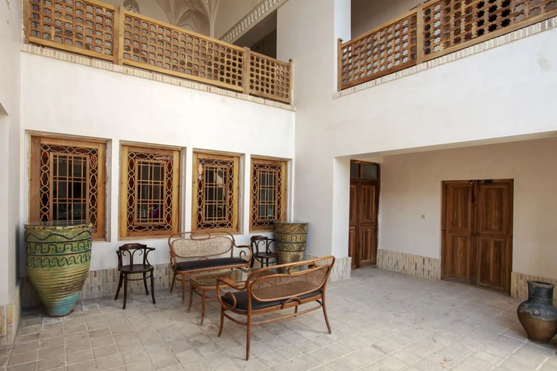 در حیاط جدید خانه مرشدی، فرش های دستبافت اصیل ایرانی، مبلمان با چوب گردو و ظرافت های تزیینی ایرانی دیده میشود.