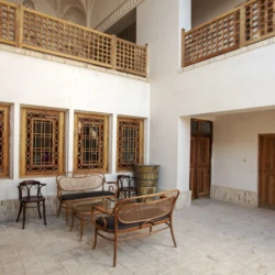 در حیاط جدید خانه مرشدی، فرش های دستبافت اصیل ایرانی، مبلمان با چوب گردو و ظرافت های تزیینی ایرانی دیده میشود.